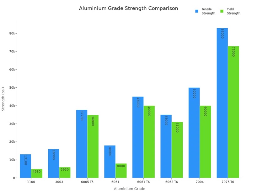You see clear differences in aluminium profile types and their industrial uses. The table below highlights how alloy choice impacts strength and application:
